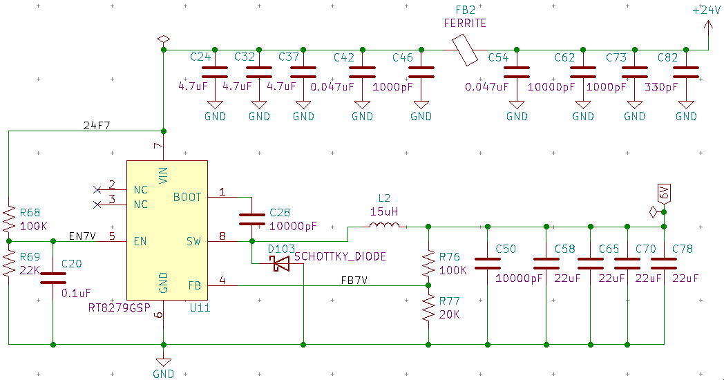 Strands 3, 6, 8, and 11 are left and are too short to drive directly from 24V. What we did was use two switching buck regulators to drop down the 24V rail to a 6V and a 16V rail. The 16V rail directly drives strands 3 and 11 while the 6V rail drives 6 and 8.