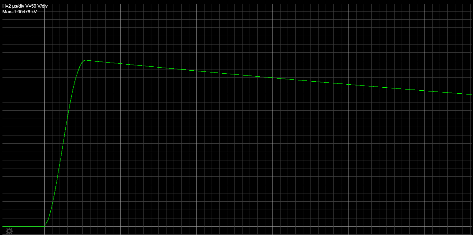 To validate the setup, the simulation output roughly matches the expected IEC waveforms. The plot below shows the open-circuit voltage (1.2/50 µs) and the short-circuit current (8/20 µs) from the generator circuit.